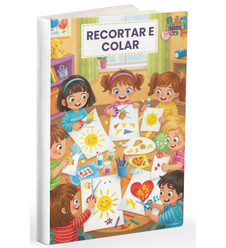 Atividades criativas com uso de tesoura e cola para desenvolver a coordenação motora fina, foco e autonomia nas tarefas.